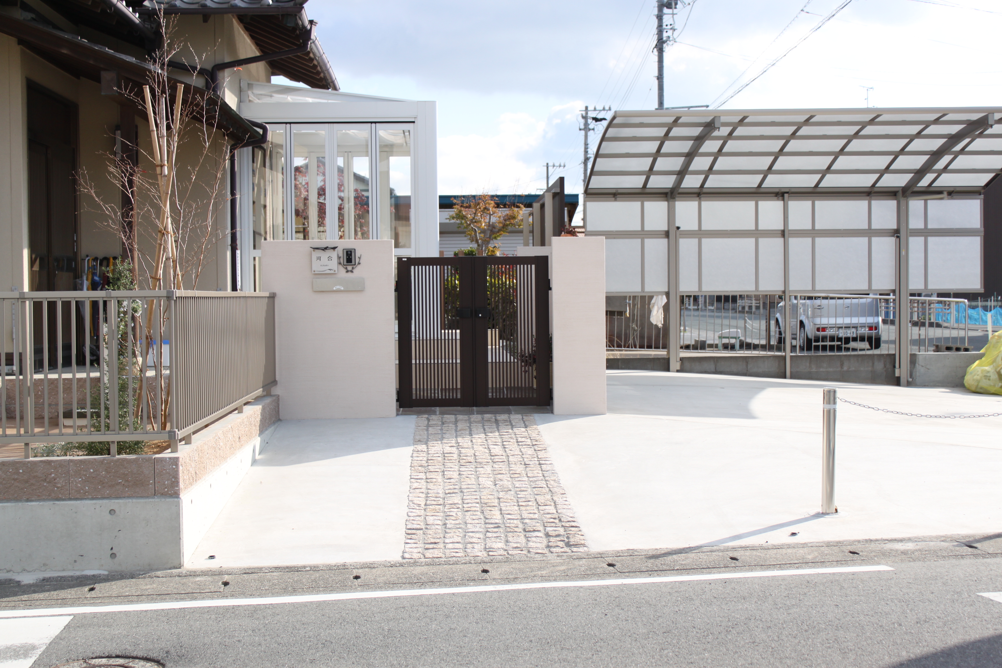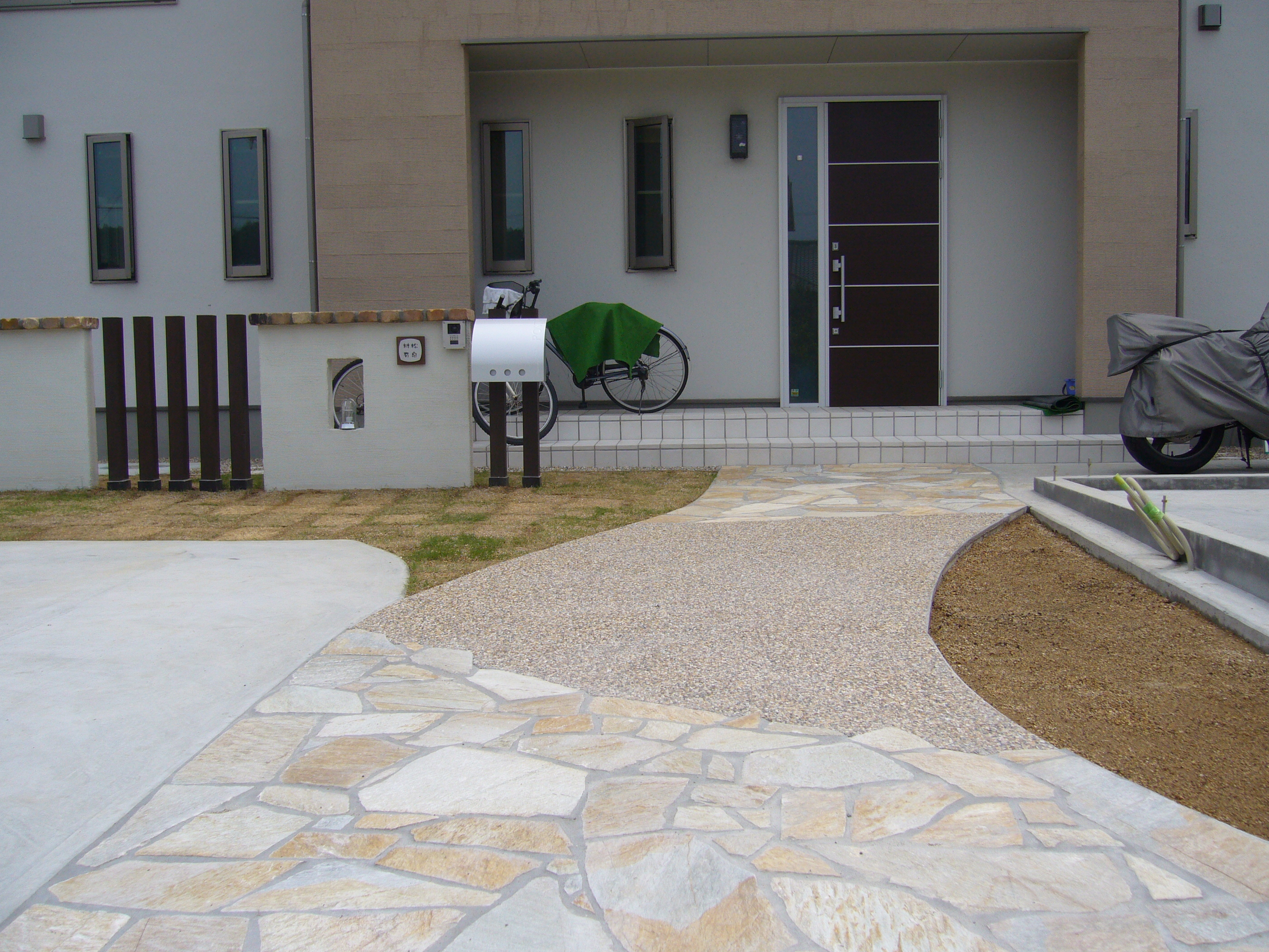二種類の異なった素材を組み合わせたアプローチです。駐車場も兼用出来るように強度も増して作成しました。