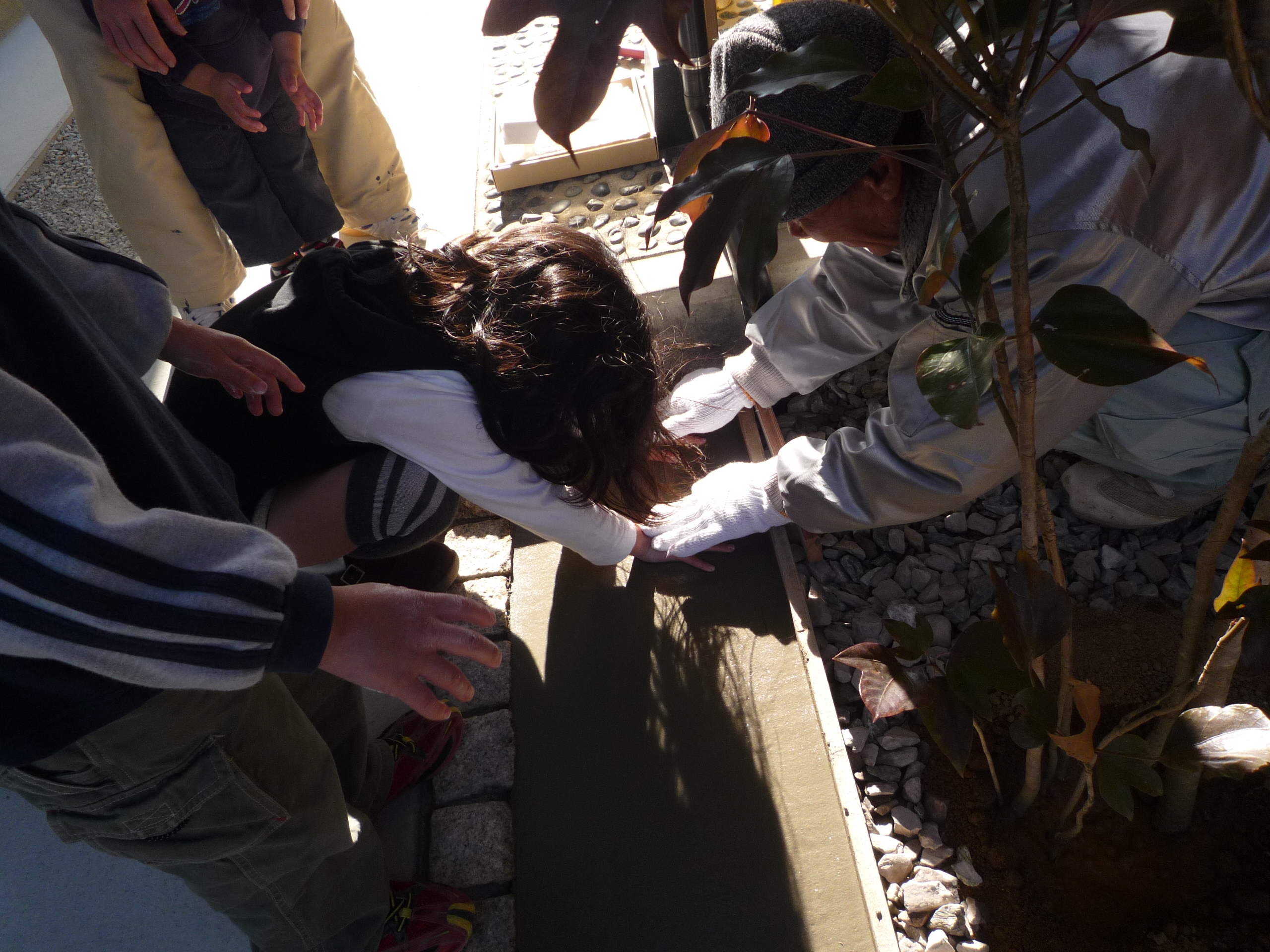 玄関からのアプローチ。常緑のカクレミノで目隠しをしその足元には子供達の手形を3人分それぞれ刻印してみました。毎日通るアプローチ脇に子供達の想い出が残ります。