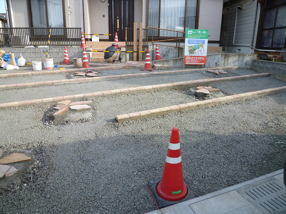 かわいいアクセントの入った駐車場の作業風景を少しご紹介します。まずはインターロッキングのラインとお花模様の乱形タイルの基礎から施工します。次に出来た部分が汚れないように養生をして、コンクリートを打設します。最後はきれいにお掃除をして、お客様へお渡しします。