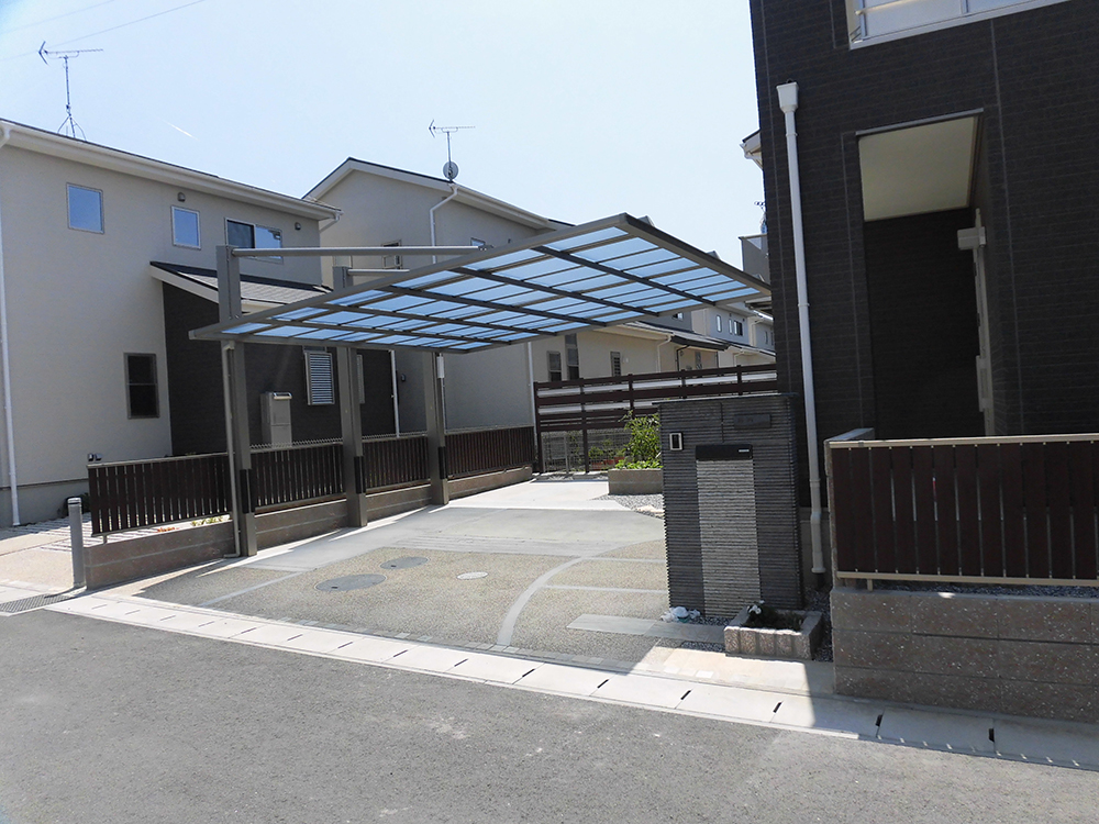 駐車場の舗装・カーポート・サイクルポートの設置を行ないました。単に舗装するだけでないのがアドシステム!アクセント付けに優しい色合いのインターロッキングを施工。単調になりがちなコンクリート面に変化をつけてみました。