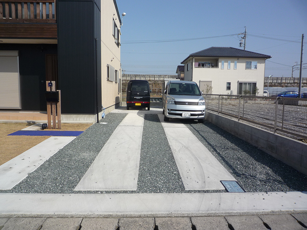 ツートンのお宅に似合うよう駐車場も青砂利とコンクリート打設でツートンにしました。デザイン性だけでなく砂利が道路に出るのを抑える効果も狙って手前にはコンクリート打設も行っています。お庭も含めてモダンな雰囲気になりました。