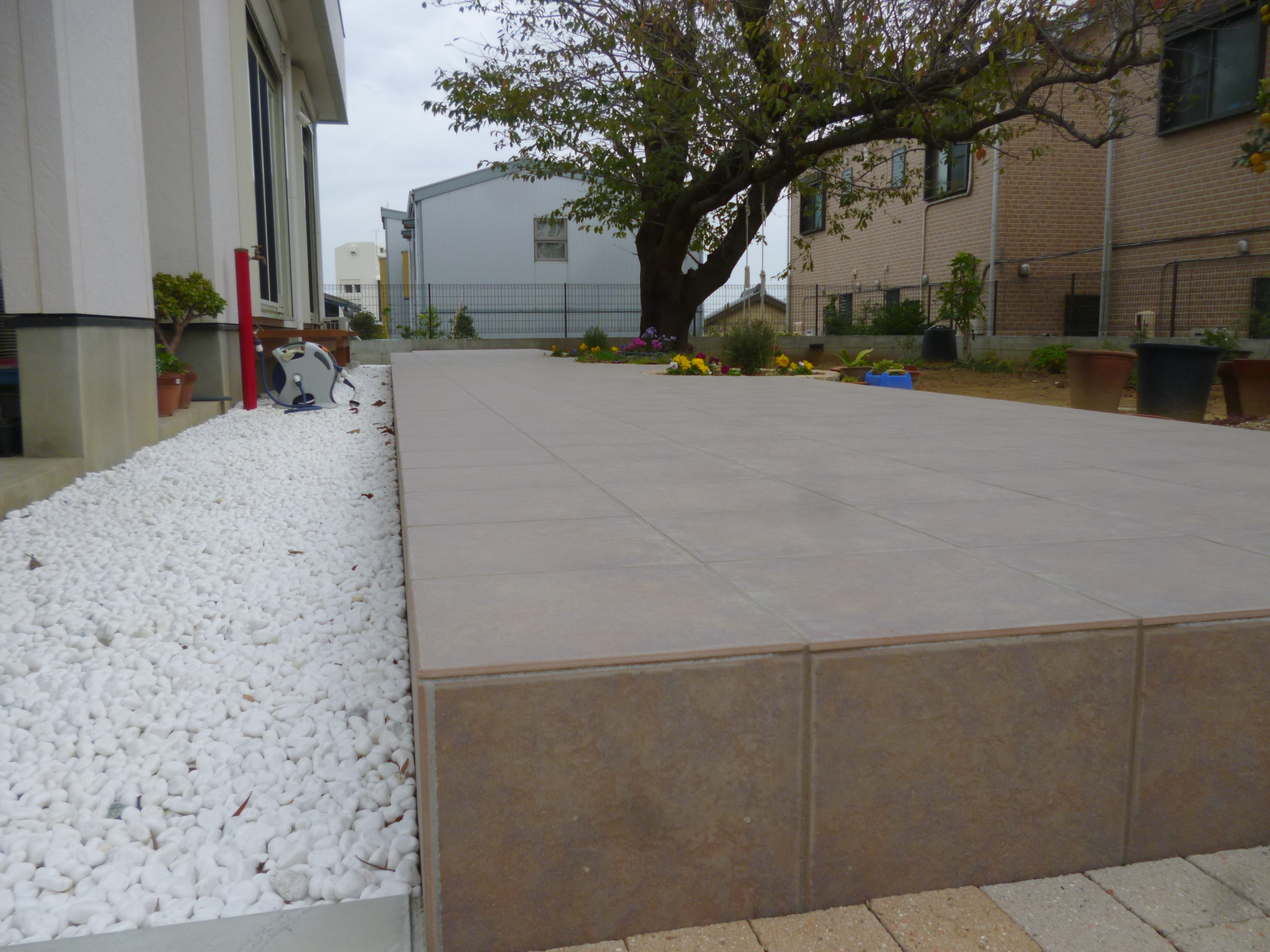 A様邸 新築とプラン作成が同時進行で進んでいましたので、ご相談を受けたときには建物の基礎ができあがっているのみの状態でした。奥様がご自宅でアロマテラピーのお店を開かれる予定でしたので駐車スペースを多くとれるようアプローチの舗装にも強度を付けています。駐車場横にはご主人が夏休みを利用してセルフビル[...] 詳細はこちら A-S様邸 幹周2mを超える大きな桜の木がある広いお庭にアクセントをつけるためにタイルデッキのご依頼を頂きました。リビングから外へ続く約2m幅のタイルデッキ!ホテルのお庭のように素敵です。さらにポイントで花壇も作りました。さっそく奥様がお花を植えてくれました。オーダーメイドのタイルデッキがご家族の笑[...] 詳細はこちら