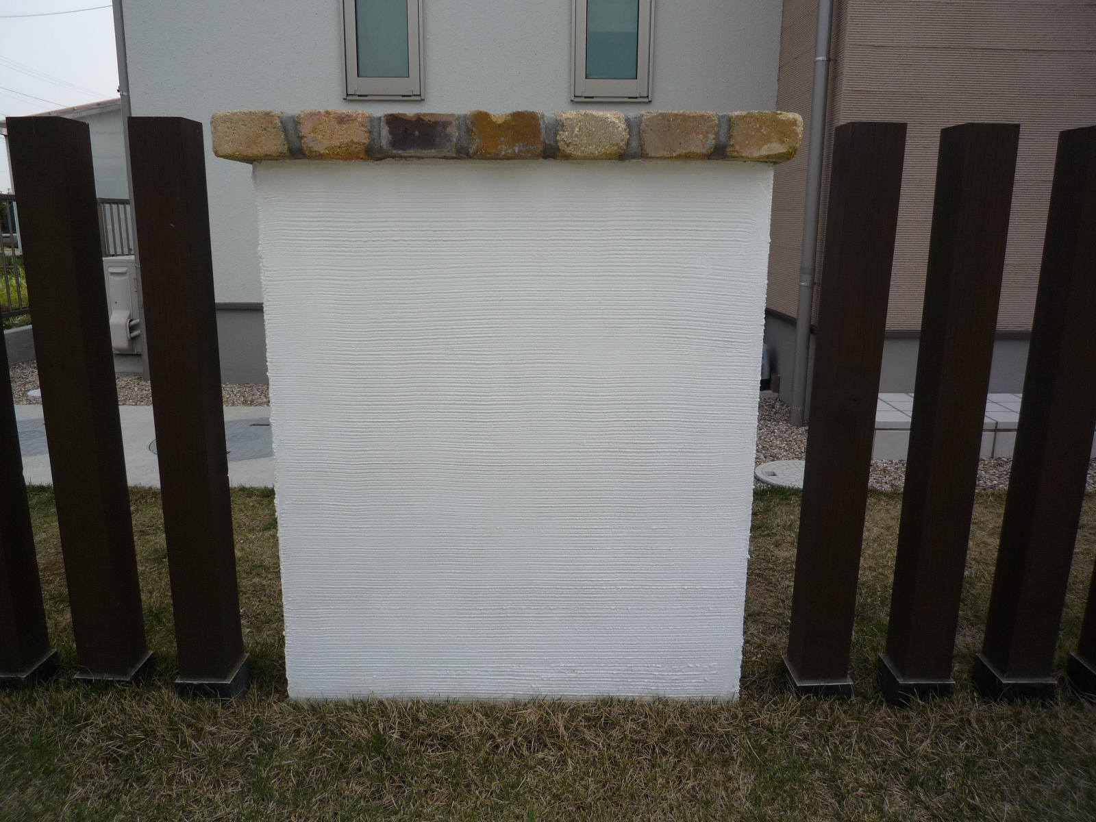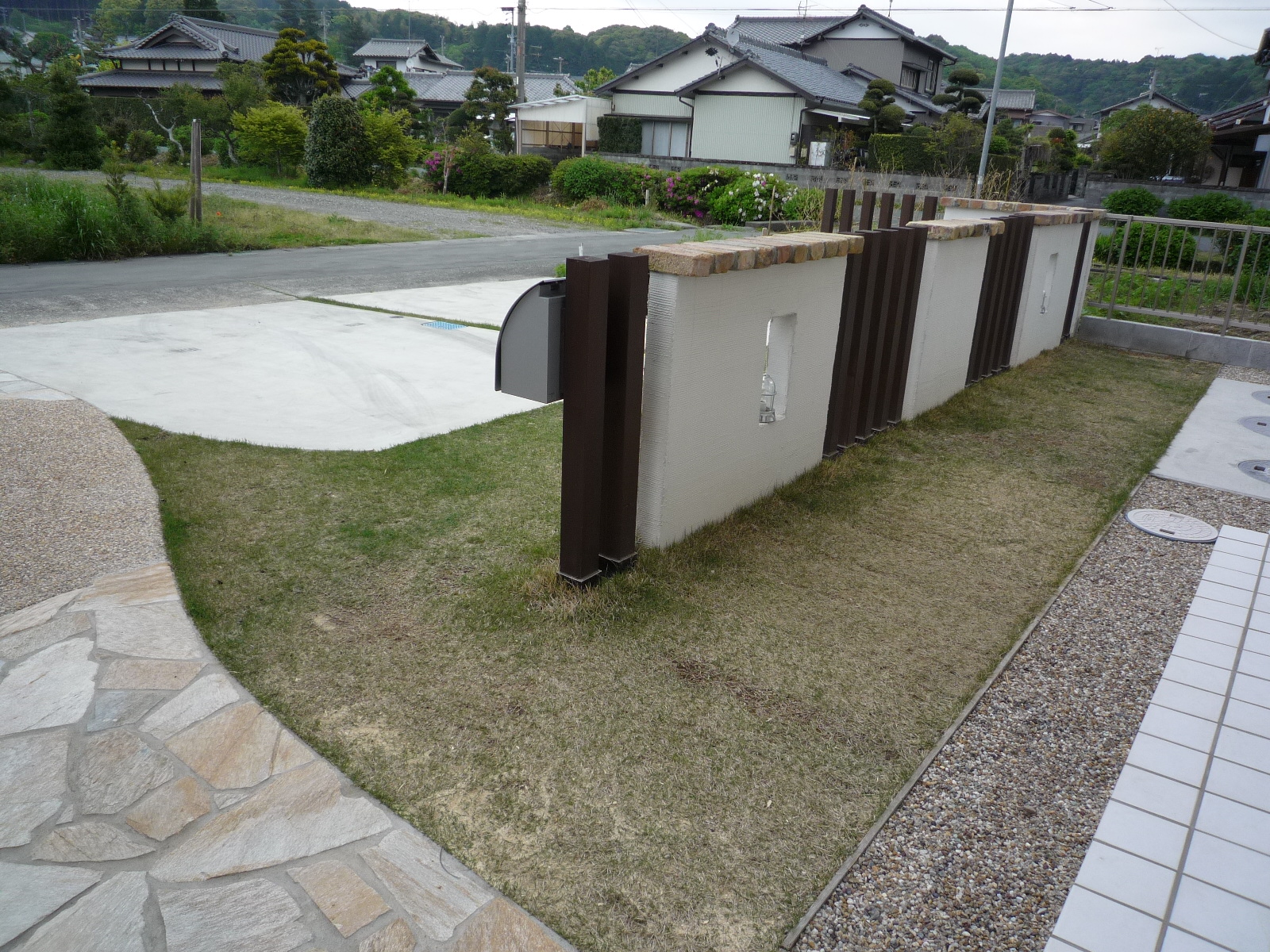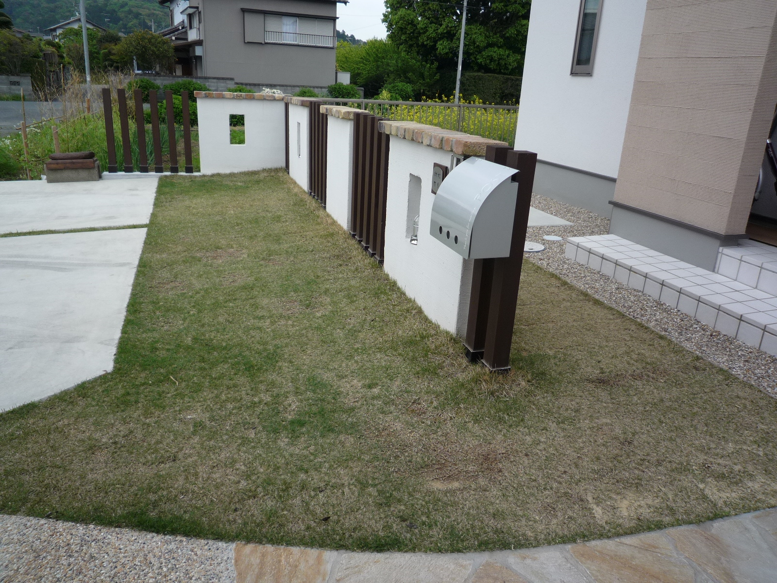 駐車場とお家の仕切りを全て、塗り壁ではなく柱をはさんだデザインの為、適度な解放感が出ました。マリンランプもポイントになっています。