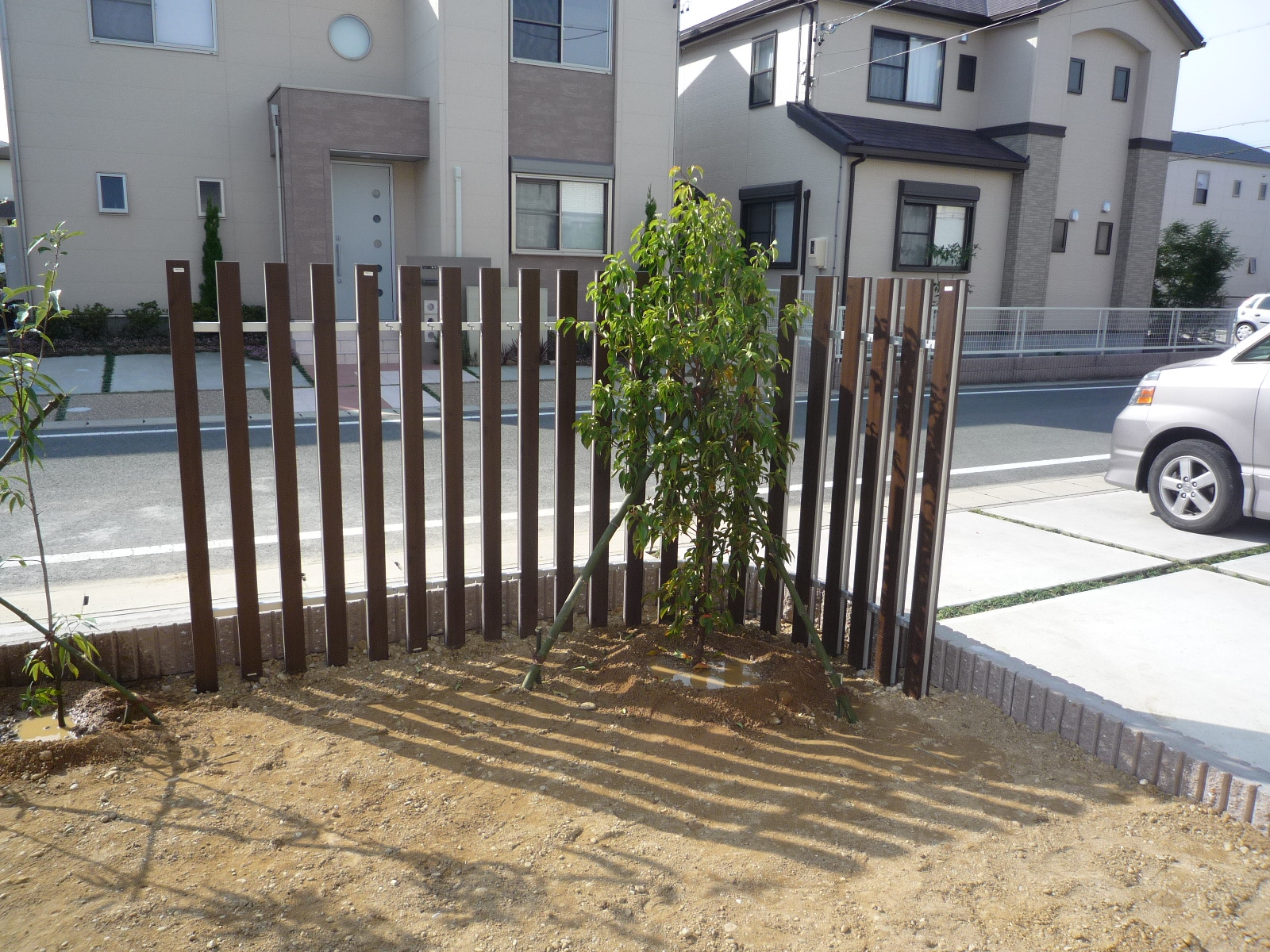 完全に囲ってしまうタイプより圧迫感のない感じがよいとのことで、柱状のフェンスをR状に設置し、常緑の樹木をアクセントに植裁してみました。